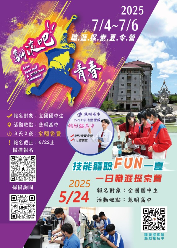主旨:檢送本校辦理<技能體驗FUN一夏>一日職涯探索營及<翻滾吧!青春>三天兩夜夏令營訊息。 (二)地點:慈明高級中學。