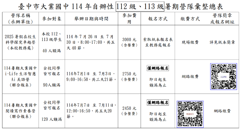 | 標題 | 大業國中114年暑期校內自辦營隊公告(112級、113級學生適用) |