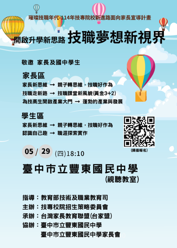 | 標題 | 轉知台灣家長教育聯盟辦理「技專院校新進路-面向家長說明宣導計畫」-114年5月29日(星期四)18時20分在台中市豐東國中視聽教室舉辦 |