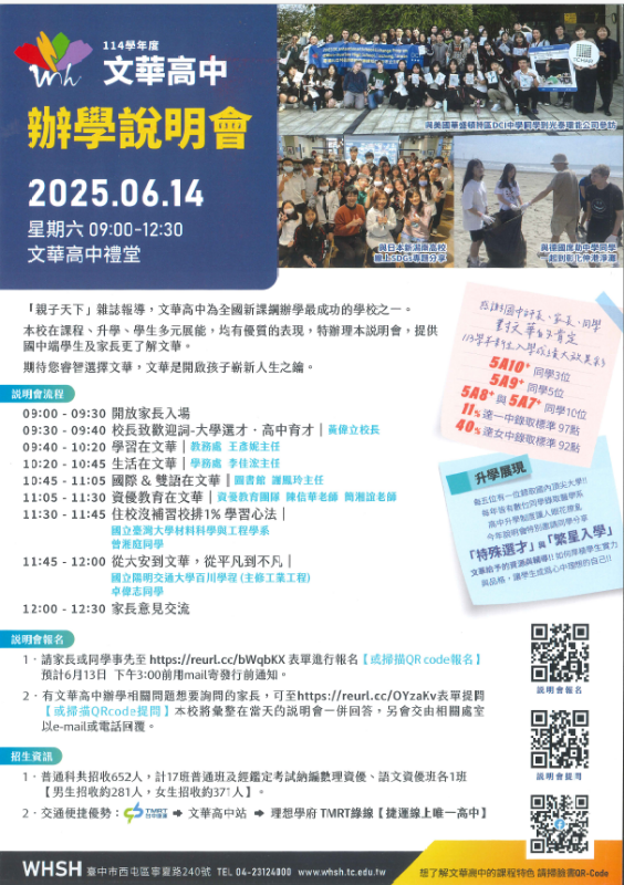 日期:114年6月14日星期六9:00至12:30 地點:文華高中禮堂 說明會報名:https://reurl.cc/bWqbKX表單進行報名(6月13日上午10時表單截止) 文華高中6月13日下午3點前寄發行前通知到信箱