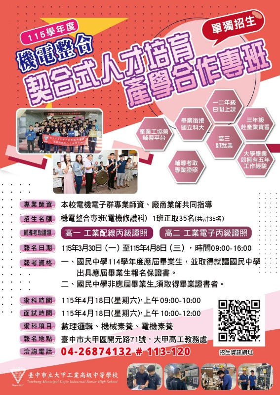 一、本專班招生科別及名額如下:(一)智慧工具機/機械加工科契合式專班:2班,共70名。(二)機電整合/電機修護科契合式專班:1班,共35名。二、報名時間:115年3月30日(星期一)至4月8日(星期三),每日9時至16時止。三、術科測驗及面試日期:115年4月18日(星期六)。四、招生資訊及簡章請至網站(https://tcvs.tc.edu.tw)查詢(首頁→產學合作專班招生公告)。