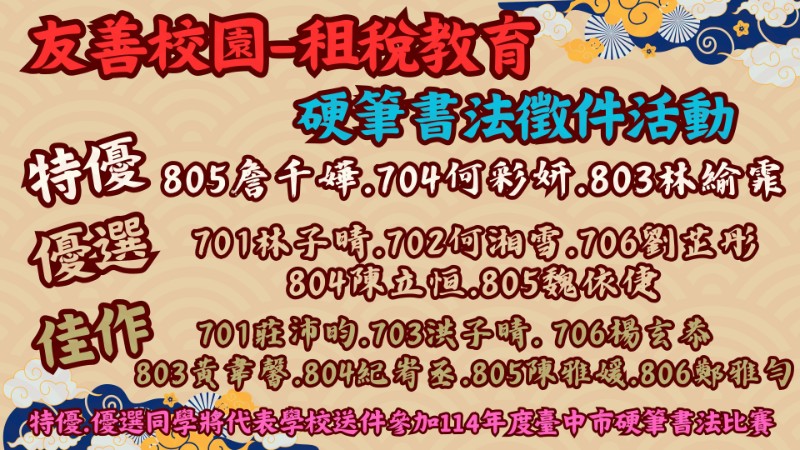 113學年度租稅教育-硬筆書法校內徵件活動成績公告