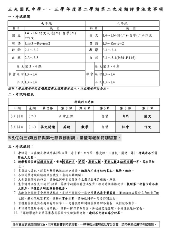 113學年度第二學期七、八年級第二次定期評量注意事項5/13(二)、5/14(三)
