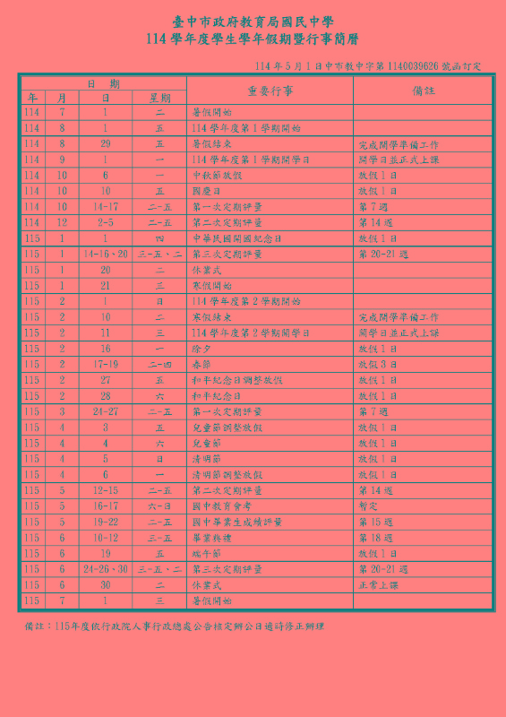 臺中市政府教育局國民中學114學年度學生學年假期暨行事簡曆