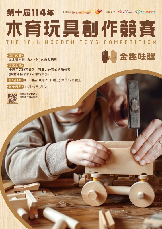 台灣玩具圖書館協會與新北市政府社會局合作辦理《114木育玩具創作競賽-第十屆金趣咪獎》, 誠摯邀請貴校師生參與競賽活動。 |