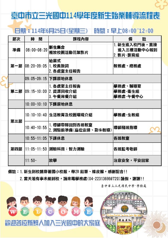 (一)日期:114年6月25日星期三(二)時間:上午8:00~12:00,請新生到校後直接至三樓活動中心報到 (三)務必攜帶物品: 2B鉛筆 及 橡皮擦;當天到校請穿著國小校服(四)備註:當天的《 詳細流程 》 與 《 新生訓練班級 》,請點選參考附件連結,歡迎同學加入溫馨的三光大家庭唷!