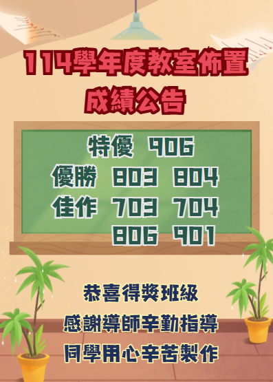 恭喜得獎班級,預計於10/20(一)升旗進行頒獎!!