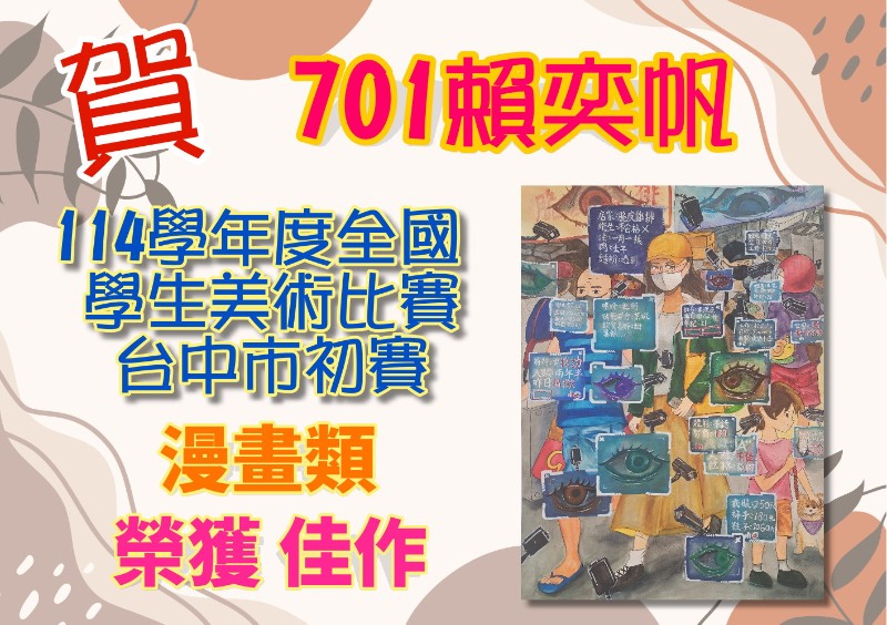 賀!!701賴奕帆同學參加114學年度全國學生美術比賽臺中市初賽榮獲《漫畫類》佳作!!!