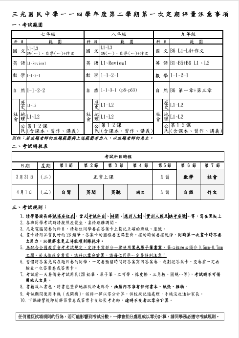 114學年度第二學期第一次定期評量注意事項3/31(二)、4/01(三)