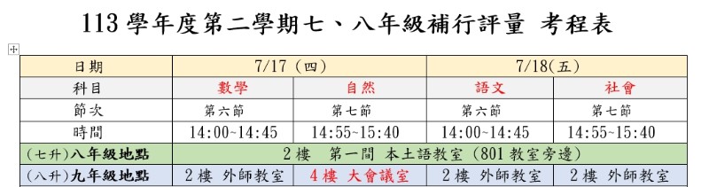| 標題 | 【113學年度第二學期補考】 七、八年級 補行評量 題庫 及 名單 | |||||||||||||||||||||