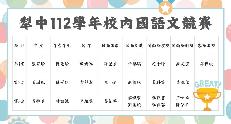| 標題 | 112學年 [校內國語文競賽]成績公告 |