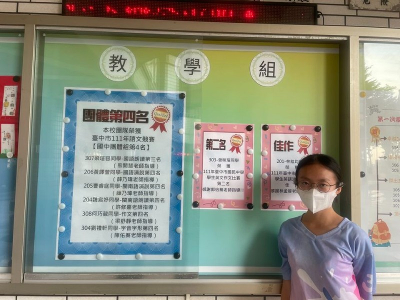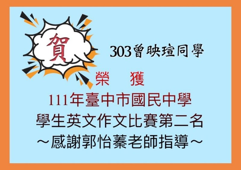 | 標題 | 《狂賀》本校303-曾映瑄同學 榮獲 111年臺中市國民中學 學生英文作文比賽第二名,感謝郭怡蓁老師指導!! |