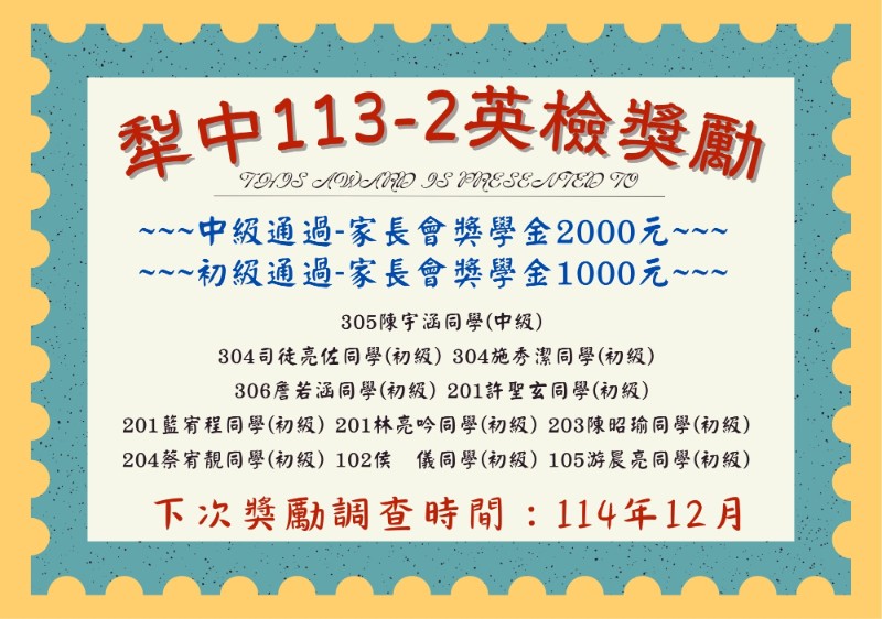 【113-2英檢獎勵】 犁中家長會鼓勵同學們參加全民英檢 (聽讀+說寫) 通過初級可申請獎勵金1000元 通過中級可申請獎勵金2000元 請同學注意英檢報名測驗日程 [全民英檢網] https://www.gept.org.tw/News/News_Show.asp?SearchID=1124 ……………………………… 114年05月26日朝會 我們進行了113-2英檢獎勵頒獎 1位同學通過中級檢定 獲得2000元家長會獎勵金 10位同學通過初級檢定 各獲得1000元家長會獎勵金 ………………………………… 教務處每學年進行兩次獎勵申請 上學期:12月 下學期:05月 請同學注意教學組公告 下次申請時間為114年12月 請依教務處規劃時程 帶證書正本到教務處找教學組長辦理~ ![]() ![]() |