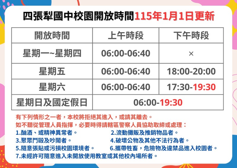 115年1月1日起 因應駐校警衛工作時間調整 校園開放時間如下 有下列情形之一者,本校將拒絕其進入,或請其離去。 如不聽從管理人員指揮,必要時得請轄區警察人員協助取締或處理: