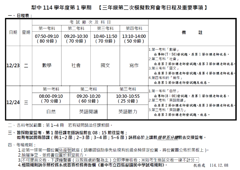 日程及重要事項 】12/23、12/24 第二次模擬考