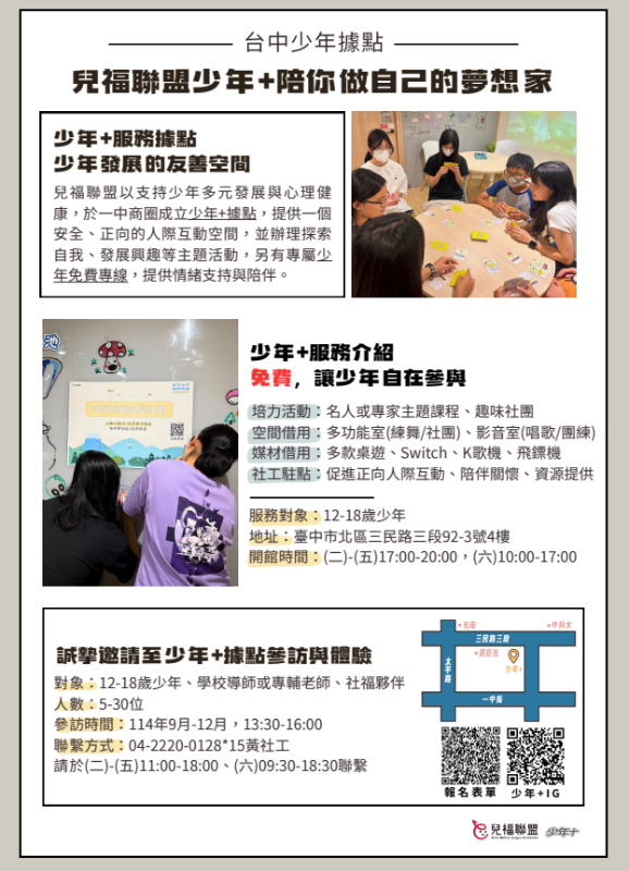 於一中商圈成立「少年+ 服務據點」,打造一處專屬少年且安心的支持培力空間。