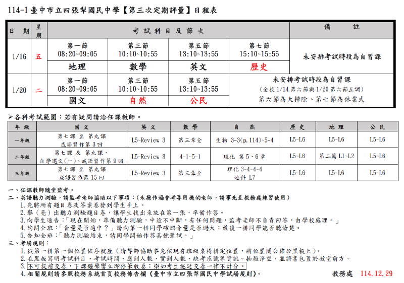 | 標題 | 114-1 臺中市立四張犁國民中學【第三次定期評量】日程表及重要事項 |