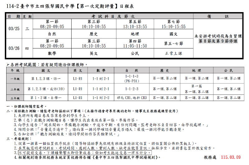 114-2 臺中市立四張犁國民中學【第一次定期評量】3/25、3/26 日程表及重要事項