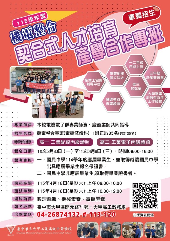 臺中市立大甲工業高級中等學校115學年度實用技能學程「契合式人才培育產學合作專班」招生資訊,請踴躍報名參加。 |