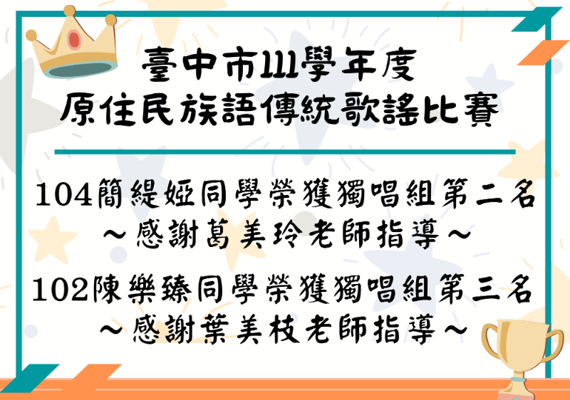 恭喜本校同學參加 臺中市111學年度原住民族語傳統歌謠比賽 成績亮眼!! 104班簡緹婭同學榮獲獨唱組第二名~感謝葛美玲老師指導~ 102班陳樂臻同學榮獲獨唱組第三名~感謝葉美枝老師指導~