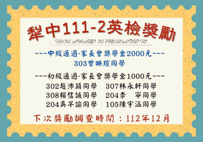 【111-2英檢獎勵】 犁中家長會鼓勵同學們參加全民英檢 (聽讀+說寫) 通過初級可申請獎勵金1000元 通過中級可申請獎勵金2000元 請同學注意英檢報名測驗日程 [全民英檢網] https://www.gept.org.tw/News/News_Show.asp?SearchID=1124 …………………………………… 112年6月5日朝會 我們進行了111-2英檢獎勵頒獎 1位同學通過中級檢定 獲得2000元家長會獎勵金 6位同學通過初級檢定 獲得1000元家長會獎勵金 ………………………………… 教務處每學年進行兩次獎勵申請 上學期:12月 下學期:05月 請同學注意教學組公告 下次申請時間 112年12月12日(二)之前 請帶證書正本到教務處找教學組長辦理~~