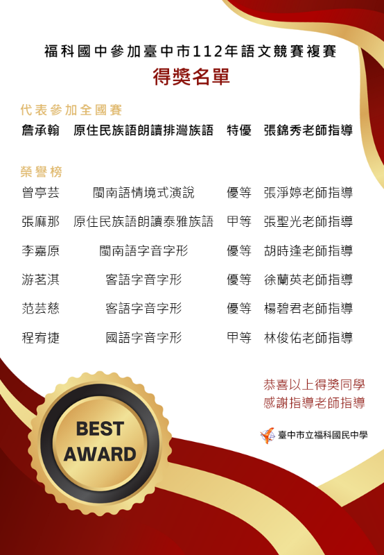 本校學生參加臺中市112年語文競賽複賽得獎名單