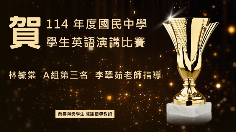| 標題 | 114 年度國民中學學生英語演講比賽 林毓棠同學榮獲A組第三名 |