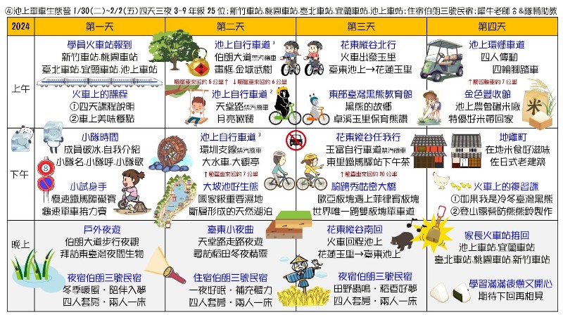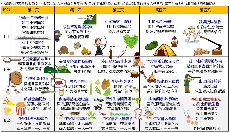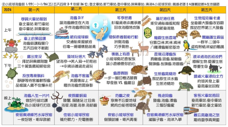 六種課程主題為:①蘭陽山野求生營(5天4夜)、②小琉球海龜營(5天4夜)、③仿生科技營(3天2夜)、④貓頭鷹飛羽營(4天3夜)、⑤池上單車生態營(4天3夜)、⑥宜蘭生態農場營(3天2夜)。 |