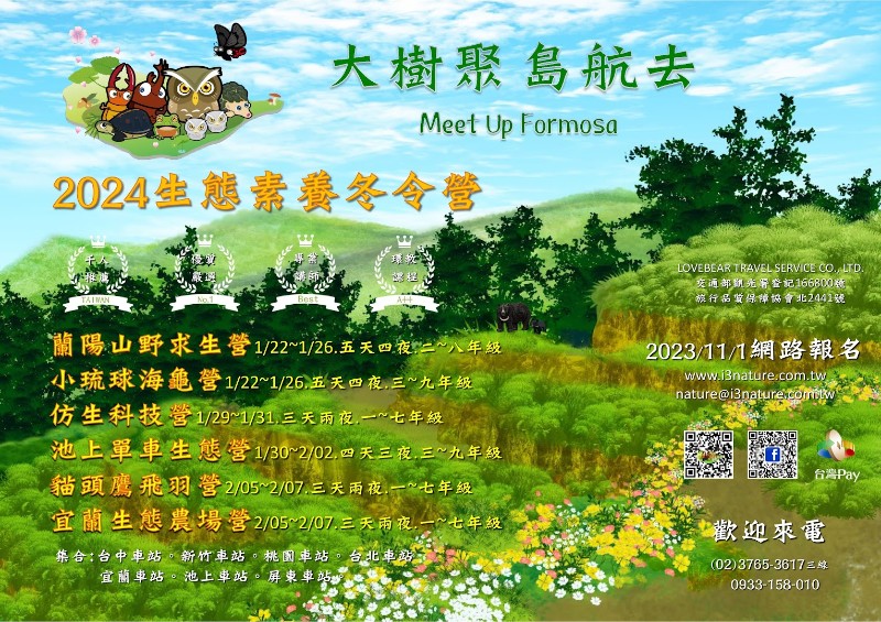 2024生態素養冬令營五種課程日期1/22~2/7,招生涵蓋1~9年級學生,詳請見網站www.i3nature.com.tw。 |