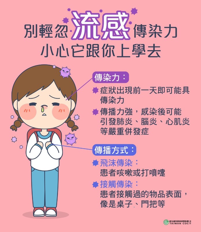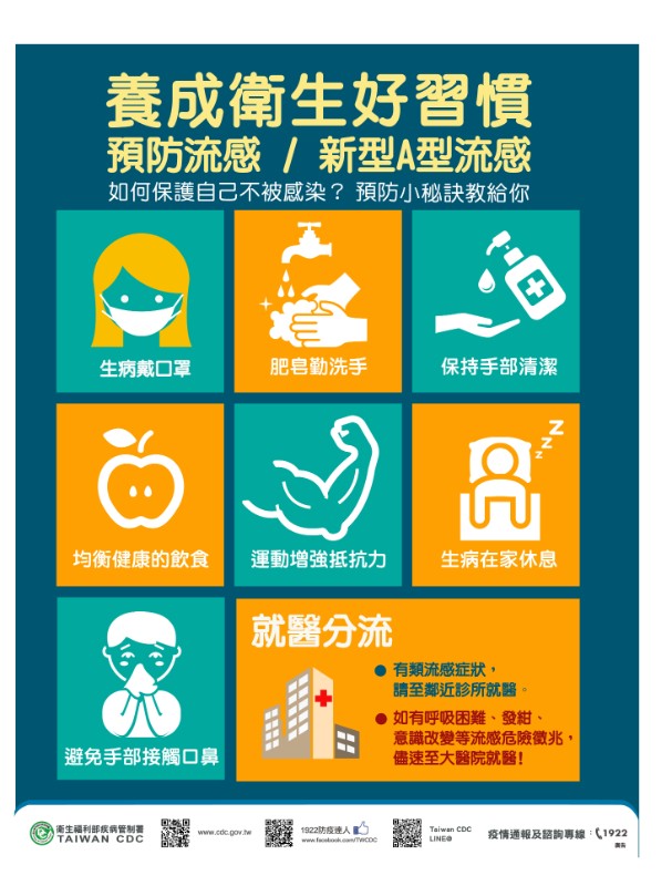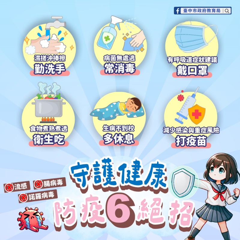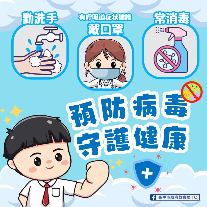 #常消毒——環境大掃除,病菌無處逃! 門把、玩具、桌椅、廁所……用合適濃度的漂白水定期消毒,打造衛生環境,讓病毒無所遁形! #戴口罩——安心防護罩! 在人多的地方、搭車、或是有呼吸道症狀時,記得戴好口罩,降低飛沫傳播的機率,讓病毒無法近身! #衛生吃——吃得安心,腸胃更健康! 食物要煮熟煮透,尤其是貝類等水產品,避免生食,選擇安全食材,守護腸胃健康! #多休息——落實生病不到校 若有疑似症狀,請好好休息,避免交叉感染,讓病毒少一個擴散機會,健康多一層保護! 如出現嘔吐及腹瀉、高燒不退、意識不清、手腳無力或麻痺、肌抽躍等重症前兆病徵,請儘速就醫 #打疫苗——防護力UP! 每年接種流感疫苗,減少感染與重症風險,讓免疫力開外掛! 流感 諾羅病毒 腸病毒 通通退散 一起守護健康 病毒不再找上門! |