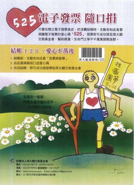財團法人周大觀文教基金會為確保沒有任何一位罹癌學生孤獨地面對癌症,也堅持時時刻刻都要有人陸伴,更不畏酷暑到街頭義演找希望—呼籲各界捐贈電子發票給愛心碼:525,雖然每筆發票中獎率平均只有新台幣1元,但累積超來就能默默幫助每年新增六百多位罹癌學生,宣導隨口捐贈電子發票玲愛心碼:525事宜,請大家一起為生命搏鬥學生助一臂之力。