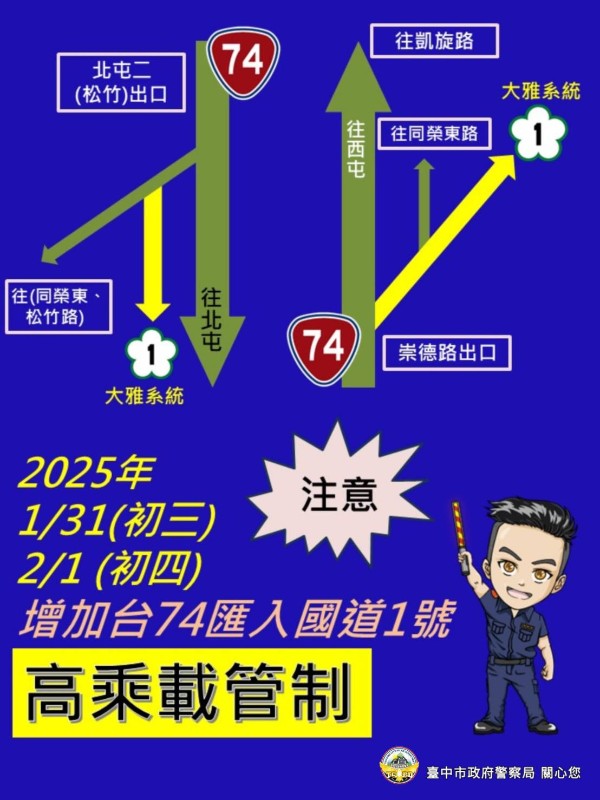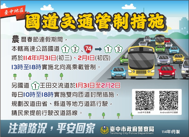 114年春節連假期間,本轄高速公路國道1號、3號將於1月31日(初三)、2月1日(初四)13時至18時實施北向高乘載管制。另國道1號王田交流道於1月31日至2月2日,每日10時至18時實施雙向匝道封閉措施,請民眾改由省、縣道等地方道路行駛。 |