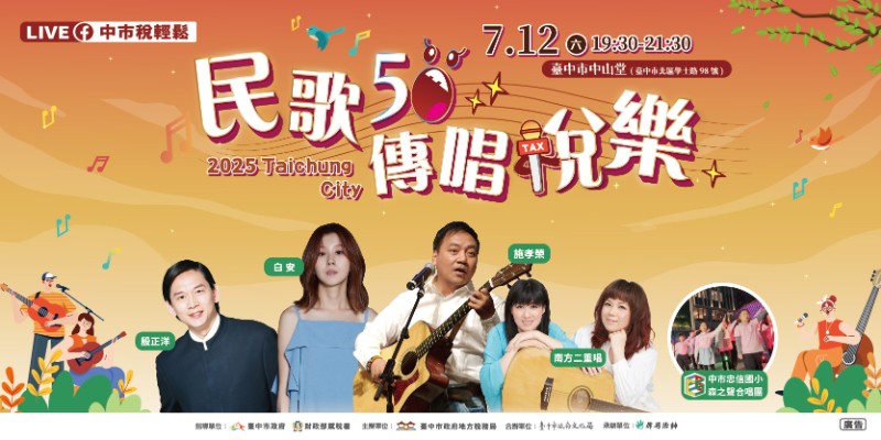 本局訂於本(114)年7月12日(星期六)假臺中市中山堂舉辦「民歌50 傳唱稅樂」演唱會活動,邀請施孝榮、南方二重唱、殷正洋與白安等知名歌手及森之聲合唱團同台演唱。演唱會以捐贈發票兌換入場券方式辦理,兌票時間為6月23日至7月8日。 |