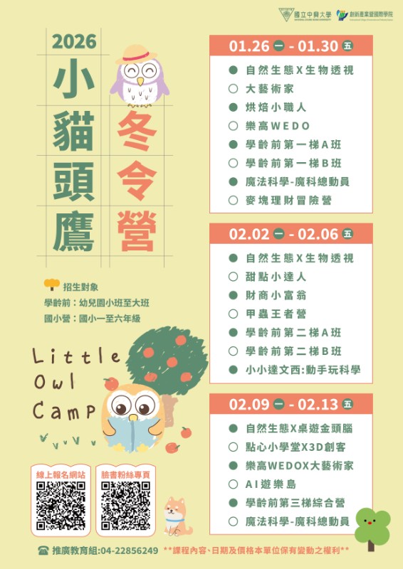 營隊課程及收費標準請詳閱營隊簡章(附件),惠請協助公告宣傳。報名方式至線上報名系統www.siileec.com。FB請搜尋:NCHUSMARTOWL;IG請搜尋:littleowl_nchu |