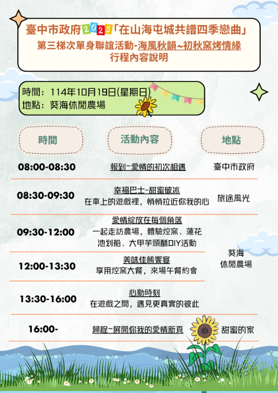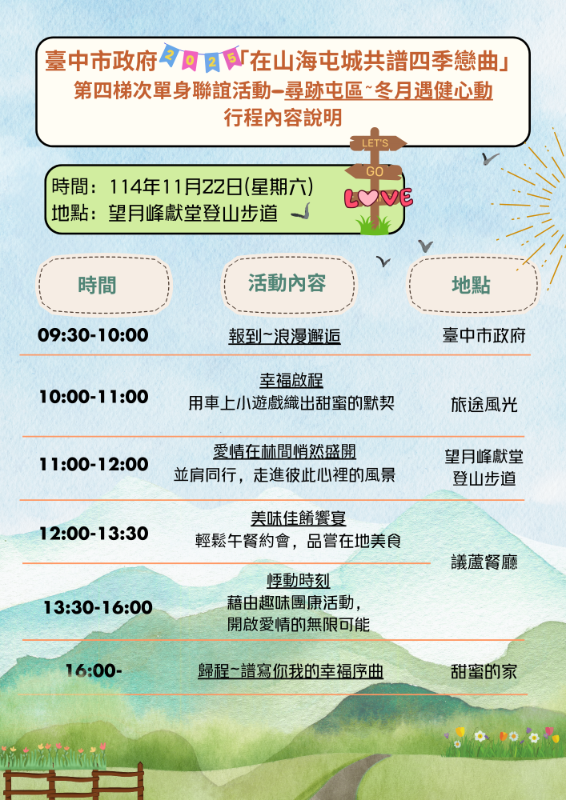 轉知臺中市政府2025「在山海屯城共譜四季戀曲」單身員工聯誼活動計畫及第三、四梯次行程內容說明各1份
