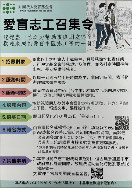 財團法人愛盲基金會 志工招募、 低視能/盲友服務 資訊