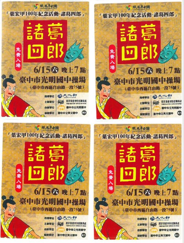 紙風車劇團-【葉宏甲100年紀念活動-諸葛四郎】(免費入場), 06/15(六)晚上7點, 臺中市光明國中操場(臺中市西區自由路一段75號), 劇場宣傳貼紙可至總務處前班級信箱上自由領取。 歡迎有興趣的同學前往觀賞~