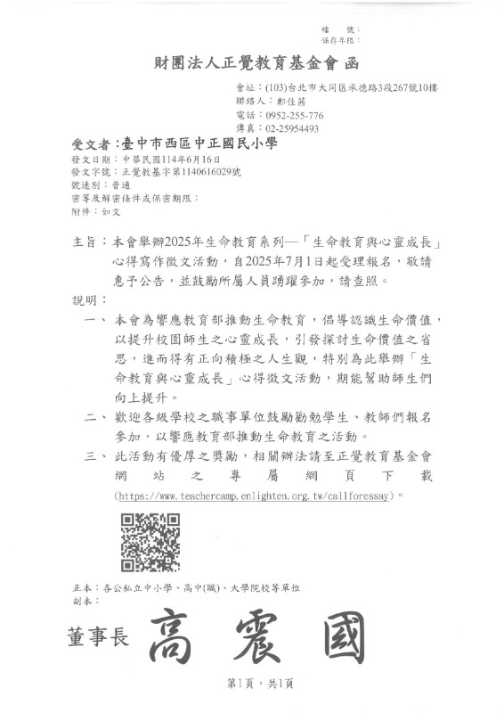 | 標題 | 正覺教育基金會2025年生命教育系列-「生命教育與心靈成長」 心得寫作徵文活動 |