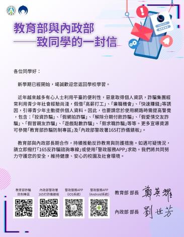 114年度詐騙防制宣導~ 為提升學生及家長之防詐免疫力,教育部與內政部共同製作致家長的一封信,提醒家長有關小學生及中學生常遇到的詐騙手法,並提供「教育部詐騙防制專區」、「內政部警政署165打詐儀錶板」及「警政服務APP」等相關參考資訊。 |