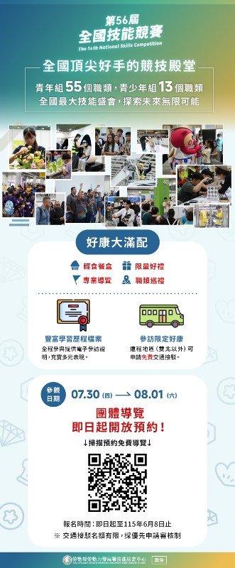 說明: 一、旨揭競賽活動之競賽日程訂於115年7月30日(星期四)至8月1日(星期六)假台北南港展覽館1、2館(臺北市南港區經貿二路1、2 號)舉辦,本次辦理青年組55職類與青少年組13職類,共計68職類,為職業訓練與技職教育之年度盛事。 二、為協助偏遠地區或交通不便之學校師生,本次活動提供接送服務,因名額有限,採先申請先審核方式辦理,建請儘速將旨揭活動納入年度行程並提出申請,以免向隅。 三、承上,免費交通接送與導覽服務之申請截止日期為115年6月8日(星期一),如有任何問題,請洽本活動受託單位:臺北市電腦商業同業公會許小姐,電話:(02)25774249分機853 ,電子郵件:ginhsu@mail.tca.org.tw。 四、旨揭活動資訊請參考以下宣傳平台,歡迎協助轉發並鼓勵應用: (一) 活動官網:https://worldskillstw.wdasec.gov.tw/ (二) FaceBook:https://www.facebook.com/WDASEC (三) Instagram:https://www.instagram.com/worldskillstw/ 五、檢送旨揭競賽活動團體導覽EDM及相關說明各1份。
