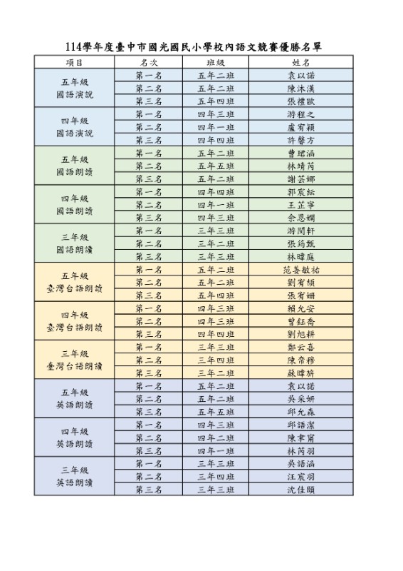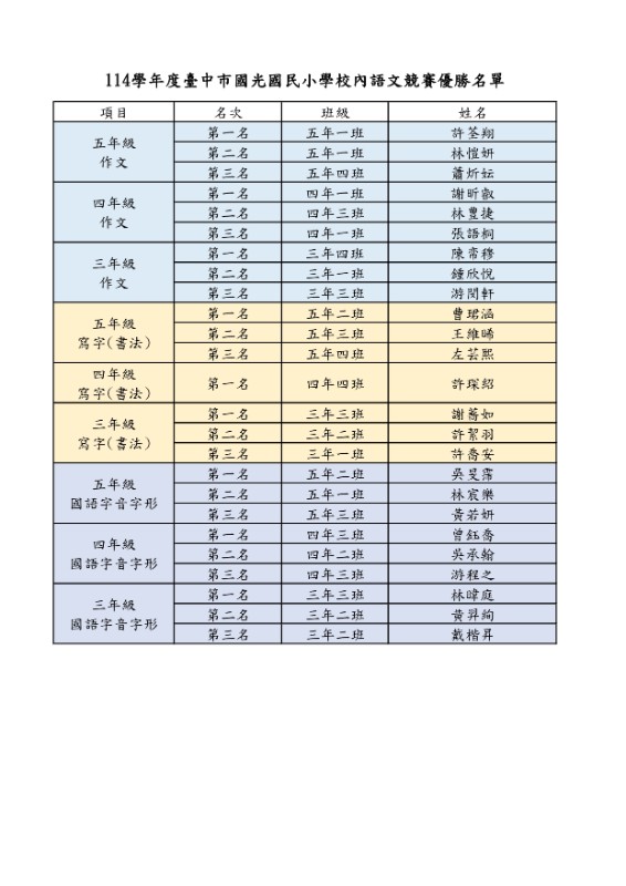 公告~114學年度臺中市國光國民小學校內語文競賽優勝名單