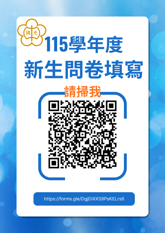 親愛的小一新生家長,您好: 歡迎您的孩子加入國光國小這個大家庭! 為了能進行後續的新生建檔,我們需要請您協助填寫這份「問卷調查表」。 https://forms.gle/jDGtdTZULnbCZMdL6 |