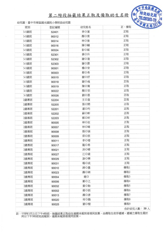 臺中市南區國光附幼115學年度第二階段抽籤結果正取及備取幼生名冊