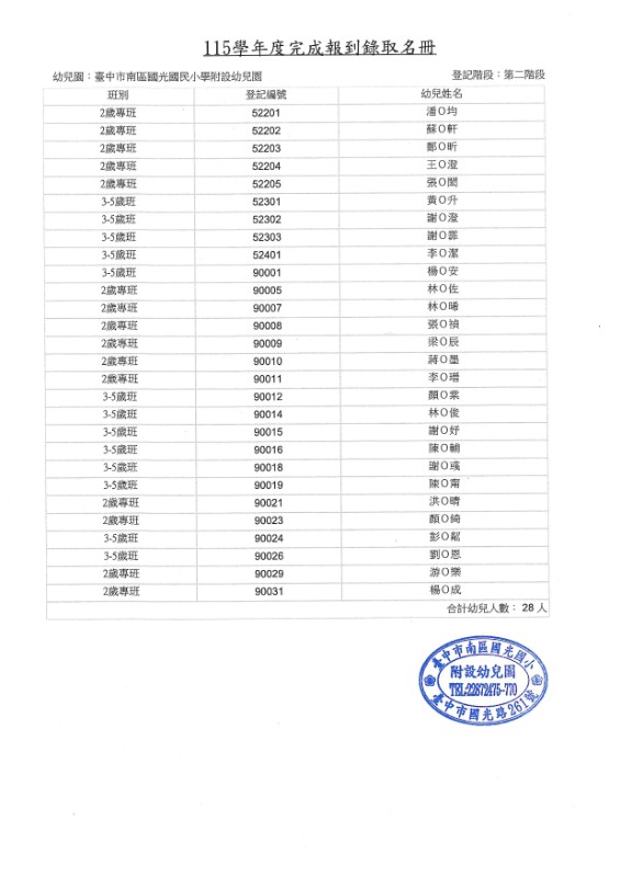臺中市南區國光附幼115學年度第二階段招生完成報到錄取名冊