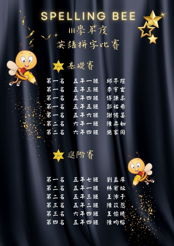 111學年度英語拼字王基礎賽及進階賽獲獎名單