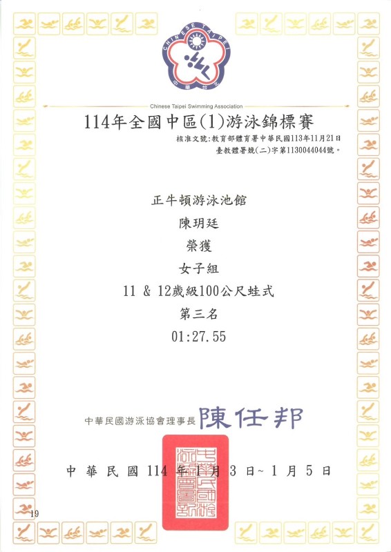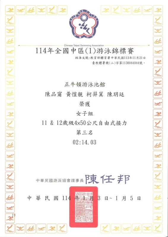 恭賀本校生參加114年全國中區(1)游泳錦標賽 602陳玥廷 榮獲(11/12歲級) 50M自由式第二名/50M蛙式第二名/100M蛙式第三名 50MX4自由式接力第三名/50MX4混合式接力第四名