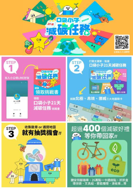 小公視同步推出「口袋小子21天減碳任務」,邀請教師、學生透過每日任務,學習減碳知識並累積行動徽章,有機會抽中超過400項豐富獎品,包括捷安特腳踏車、綠點、一卡通、文具組與節能好物。參加方式如下: |