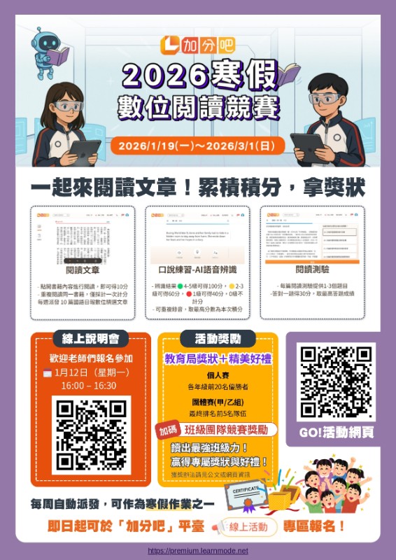 請至活動網頁使用教育雲端帳戶登入完成報名(https://activity.www.learnmode.net/reading-contest-2026/)。