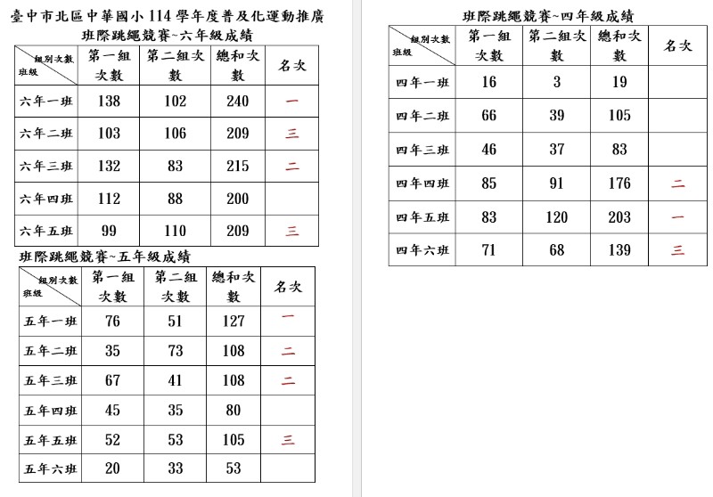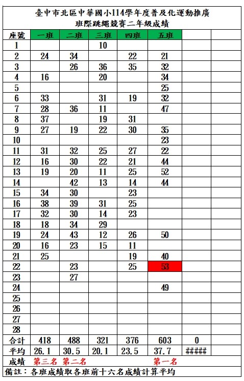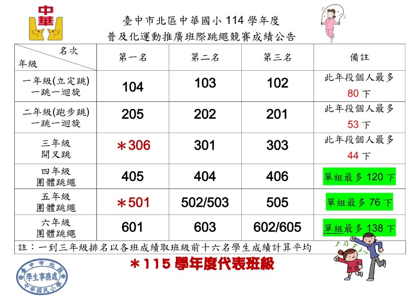 114 學年度普及化運動推廣班際跳繩競賽成績公告~~~恭喜獲獎班級