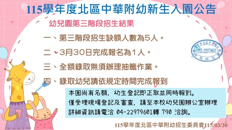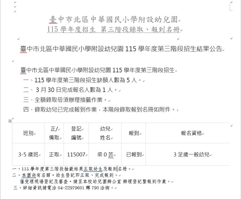 【115招生】臺中市北區中華國民小學附幼115學年度招生第三階段報名結果